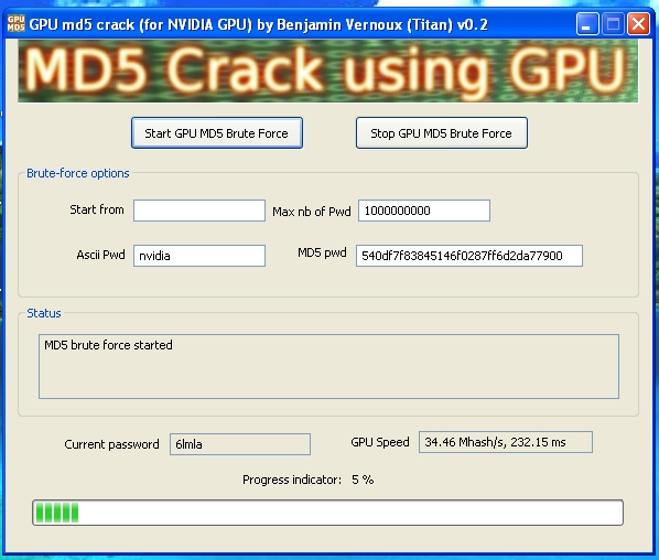 Cet utilitaire permet de casser une clef MD5 en mois de 25 secondes avec une carte graphique comme Nvidia GeForce 210 ou plus puissante. Cet utilitaire utilise la force brute de la carte vidéo afin d'inverser la clef MD5 et de trouver le mot de passe si cachant.