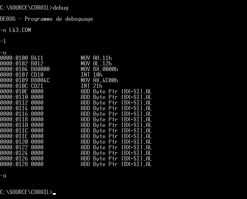 L'exemple suivant permet de lancer DEBUG, de charger un fichier L43.COM fournit avec les pilotes de ATI VGA Wonder en 1988, de le désassembler et de quitter :
